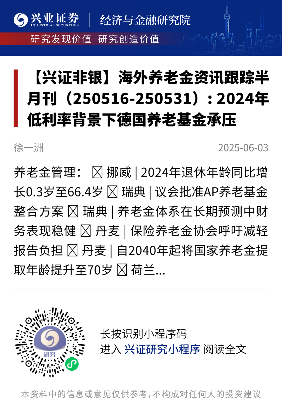 咱们发布了《国际待业金资讯追踪半月刊(250516-250531):2024年低利率配景下德国养老基金承压》,接待阅读!
